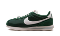 This textile sneaker features an upper base of tightly woven dark green nylon. Suede overlays in a more emerald-green shade adorn the toe cap, eye stays, and heel. White leather forms the side panel Nike swoosh and the heel tab that sports embroidered green Nike branding. The white tongue features a tongue tag with black Nike branding and an orange Nike Swoosh. A green padded collar helps add to the comfort of this sneaker, as does the springy soft foam midsole in white with a gray wedge-shaped stripe. The off-white rubber outsole features a vintage herringbone traction pattern.